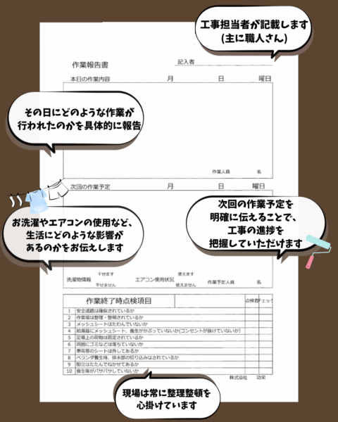 0 HOMEお知らせ事務員ブログ塗装工事中の生活、暮らしへの影響は?? 塗装工事中の生活、暮らしへの影響は?? 投稿日:2025年12月11日 カテゴリー:事務員ブログ 外壁・屋根塗装工事中はお家のまわりの足場の設置や窓の養生(ビニールはり)など、いつもの生活と大きく変わります。工事期間は約3週間ほどですが、普段の生活とは異なり、いくつかの制約や変化が生じます。そこで今回は、外壁・屋根塗装中の生活に関する疑問を解決します。これから外壁・屋根塗装をする方は、ぜひ参考にしてみてください。 🚧 外壁塗装工事中の生活の変化 1. 窓の開閉ができない期間がある 基本的に塗装工事期間中の窓の開閉は控えていただくよう、お願いしています。高圧洗浄時に水が室内に入り込むのを防ぐため、塗料の飛び散りや、シンナーなどの臭いが室内に入るのを防ぐためです。また、養生シートで窓全体を覆う場合もあるので、物理的に開閉ができなくなる事もあります。 2. 洗濯物の外干しができない 塗料の微粒子やホコリ、水が飛散し、洗濯物に付着する可能性があるため、外干しはご遠慮いただいております。工事がお休みの日は外に干せる場合もあります。その際は毎日お渡しする、作業報告書などで事前にお知らせします。 作業報告書 3.塗装工事中エアコンは通常通り使用可能 エアコンも普段どおり使用していただいて問題ありません。特に夏場の工事は、窓も十分に開けることができませんので体調管理のためにもいつも以上に室温を確認いただき、必要に応じてご使用ください。 4.工事中の騒音 足場の組み立て・解体時、高圧洗浄時など、作業中は大きな音が出ます。 実際に塗料を塗る作業ではあまり音はしませんので、安心ください。 5.車の移動や自転車の移動 足場を組む際や塗料の飛散を防ぐため、敷地内の車や自転車の移動をお願いすることがあります。その他、お車保護のカバーを付けさせていただくことがあります。 6.視界とプライバシー・防犯対策 足場と養生シートで家全体が覆われるため、日当たりが少し悪くなり、外の景色がほとんど見えなくなります。また、日中は職人さんが敷地内や窓の外で作業を行うため、カーテンを閉め切るなど、プライバシーに配慮した生活が必要になります。足場が組まれることで、普段は届かない2階や屋根への侵入が容易になります。工事期間中は、普段以上に施錠を徹底し、防犯意識を高めることが重要です。 ご心配・ご不安なことはとことん聞いてください! 塗装工事中は、普段気にならないことも「できない」となると困ってしまうものです。さらに、ご家族によっても気になるところは様々です。弊社では塗装工事中は実際に作業を行う職人が、毎日「作業報告書」に本日の作業と明日の作業を書いてお客様にお渡しをしています。作業の変更などもご報告していますので、お仕事や外出でお留守の場合でも、工事進捗を把握していただけるようにしています。工事期間中ご不便をおかけする分、私たちは丁寧な施工と近隣への最大限の配慮をもって、お客様の期待に応えるべく努めてまいります。 お知らせ一覧へ 最新の投稿 施工事例のご紹介♪ ~美しさ続くお住いへ~ 本日より通常営業となります 【施工中動画】木部の寿命は塗装で決まります! 塗装工事中の生活、暮らしへの影響は?? 【屋根カバー工法】 LIXIL T・ルーフシリーズのご紹介 お客様に安心をお届けする功栄の作業報告書 外壁塗装における【下塗り】の役割とは?? 【シーリング撤去作業】職人さんはこんな風に剝がしてます! ご自宅に合った塗料と色選びで後悔しない外壁塗装を ドローンでの屋根の点検について カテゴリー 動画 (3) 外壁塗装 (7) 無料見積もり (1) 塗料のご案内 (10) 屋根塗装 (10) 塗装工事のウソ・ホント!? (4) 社長ブログ (7) 事務員ブログ (100) DIY (3) 施工写真 (332) お知らせ (44) 施工動画 (158) アフター点検 (55) その他 (100) 月別アーカイブ 2026年1月 (2) 2025年12月 (3) 2025年11月 (3) 2025年10月 (4) 2025年9月 (3) 2025年8月 (5) 2025年7月 (3) 2025年6月 (4) 2025年5月 (3) 2025年4月 (4) 2025年3月 (5) 2025年2月 (3) 横浜市で安心と信頼の外壁塗装をするなら功栄にお任せ! Copyright © 2014 功栄 All Rights Reserved.